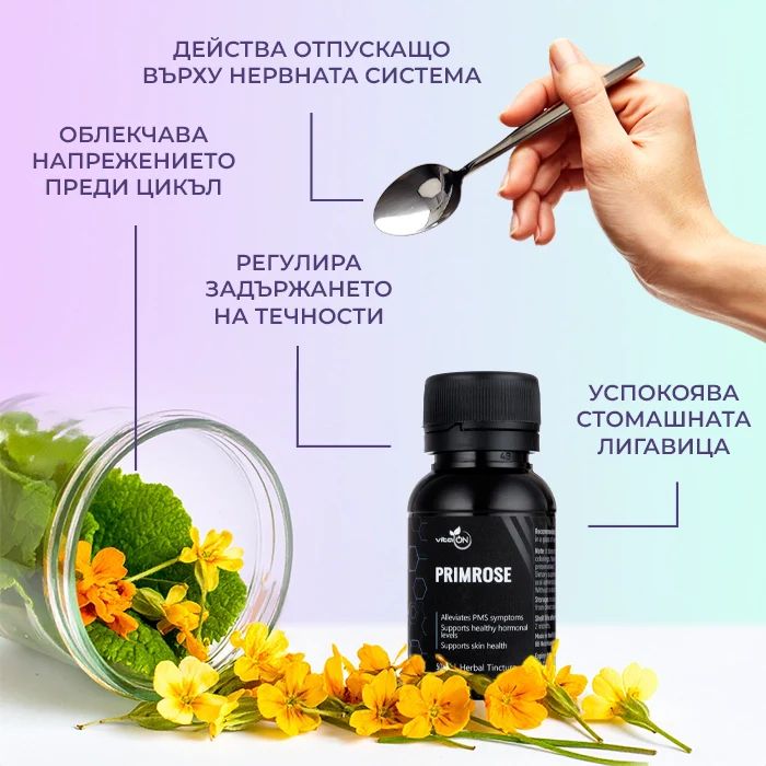 - Облекчава симптомите на предменструален синдром (ПМС): Успокоява емоционалното напрежение, раздразнителността и облекчава физическия дискомфорт и спазмите.